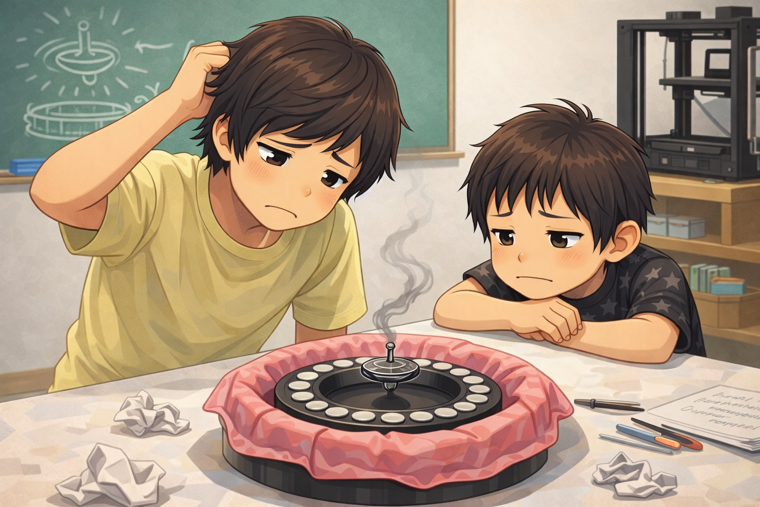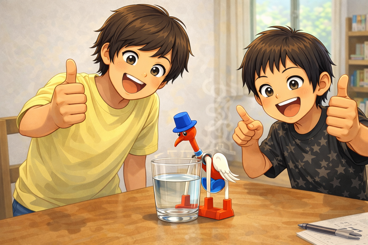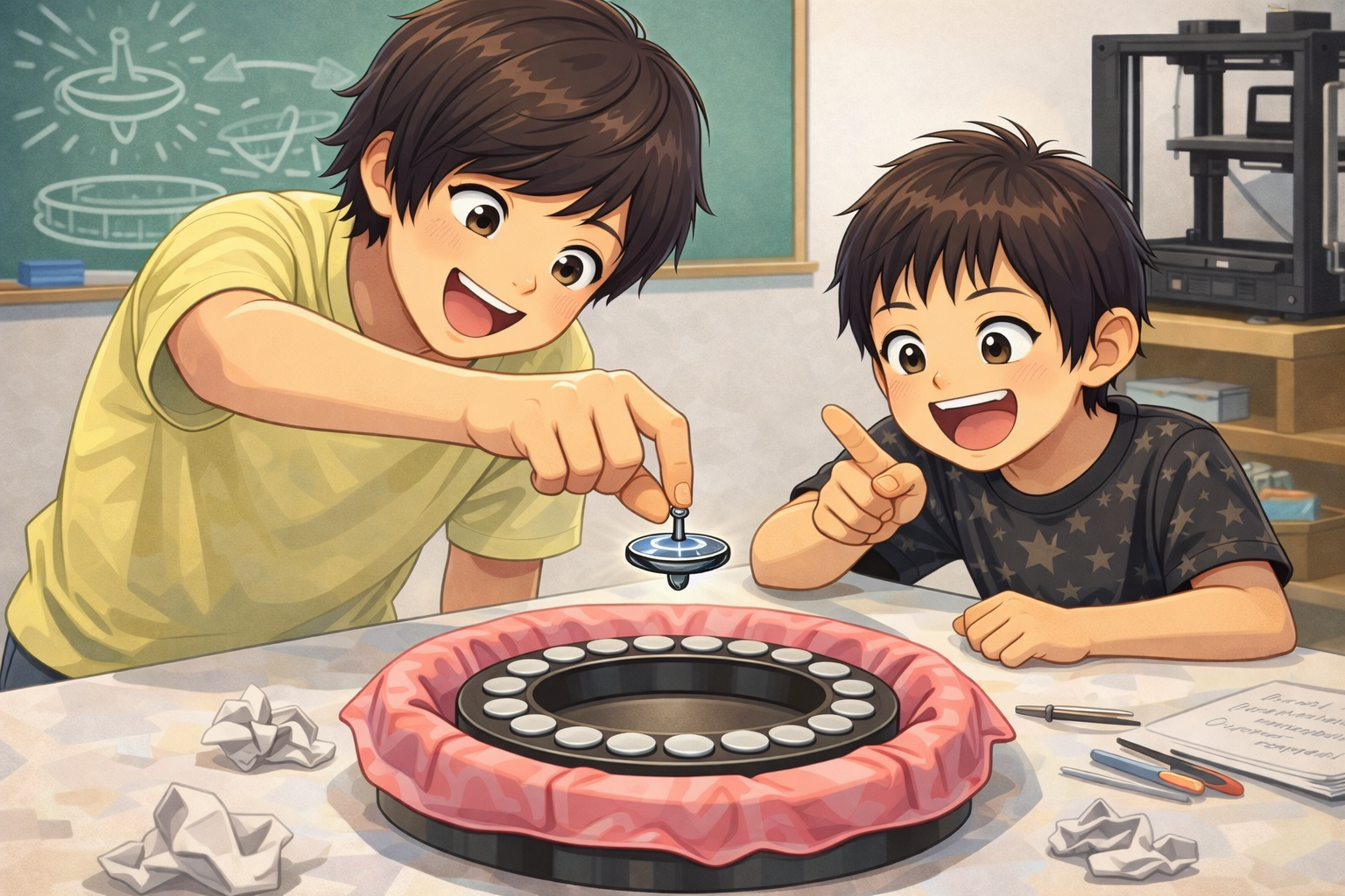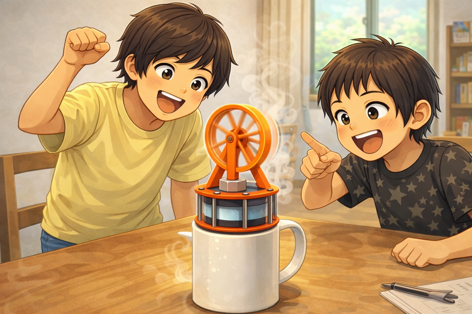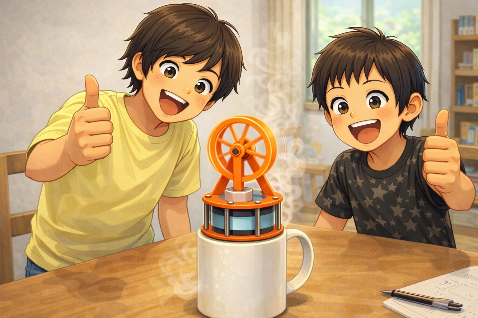<35> (特別クラス)講師の専門分野・興味分野に関する 授業を夏休みの特別クラスとして実施しました。テーマは「永久機関を考える」。 今回のユーチューブでいろいろなフェイク永久機関を確認して、 「永久機関とは違うんだけど動き続けて不思議なものを3つ」を見てみました。 以下、クラス写真を基に生成AIが作った画像です。