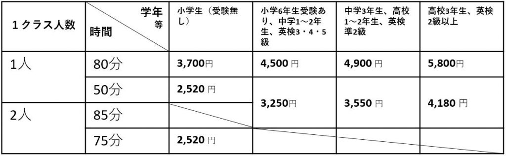※2人クラスのご受講で、もう一人の生徒さんがお休みの場合、2人クラスは自動的に一人クラス時間に変更されます(↓クラスの授業料表参照)。
